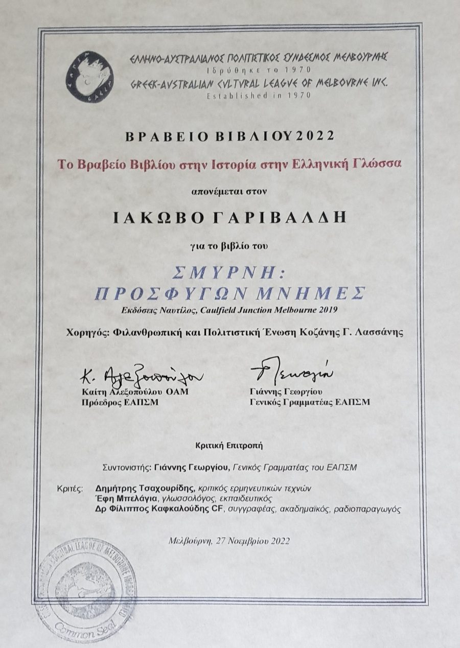 Το 2022 ο συγγραφέας Ιάκωβος Γαριβάλδης έλαβε το ετήσιο βραβείο βιβλίου από τον Ελληνο-Αυστραλιανό Πολιτιστικό Σύνδεσμο και την Ιστορία στην Ελληνική Γλώσσα, για την έκδοση “ΣΜΥΡΝΗ – Προσφύγων Μνήμες” και τη σειρά εκδόσεων που συμπεριλαμβάνει “Νικομήδεια”, “Προύσα”, “Καππαδοκία”.
